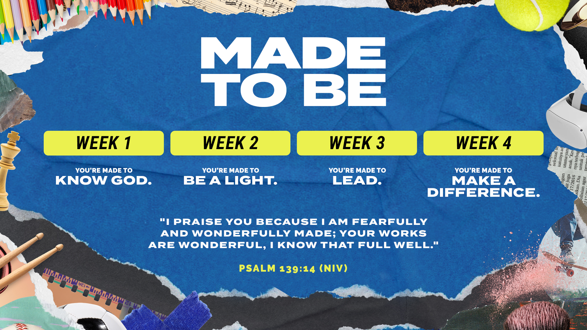 What were you made for? We’ve all wondered who we are, what makes us unique, and how we’re supposed to make a difference in the world. It’s easy to feel like our interests and talents are just random, but the truth is that God created each of us with a purpose to do amazing things. In this 4-week series from the Old and New Testaments, we’ll see that you’re made to know God and how the things you love might be exactly how God works through you because you’re made to be a light, to lead, and to make a difference.