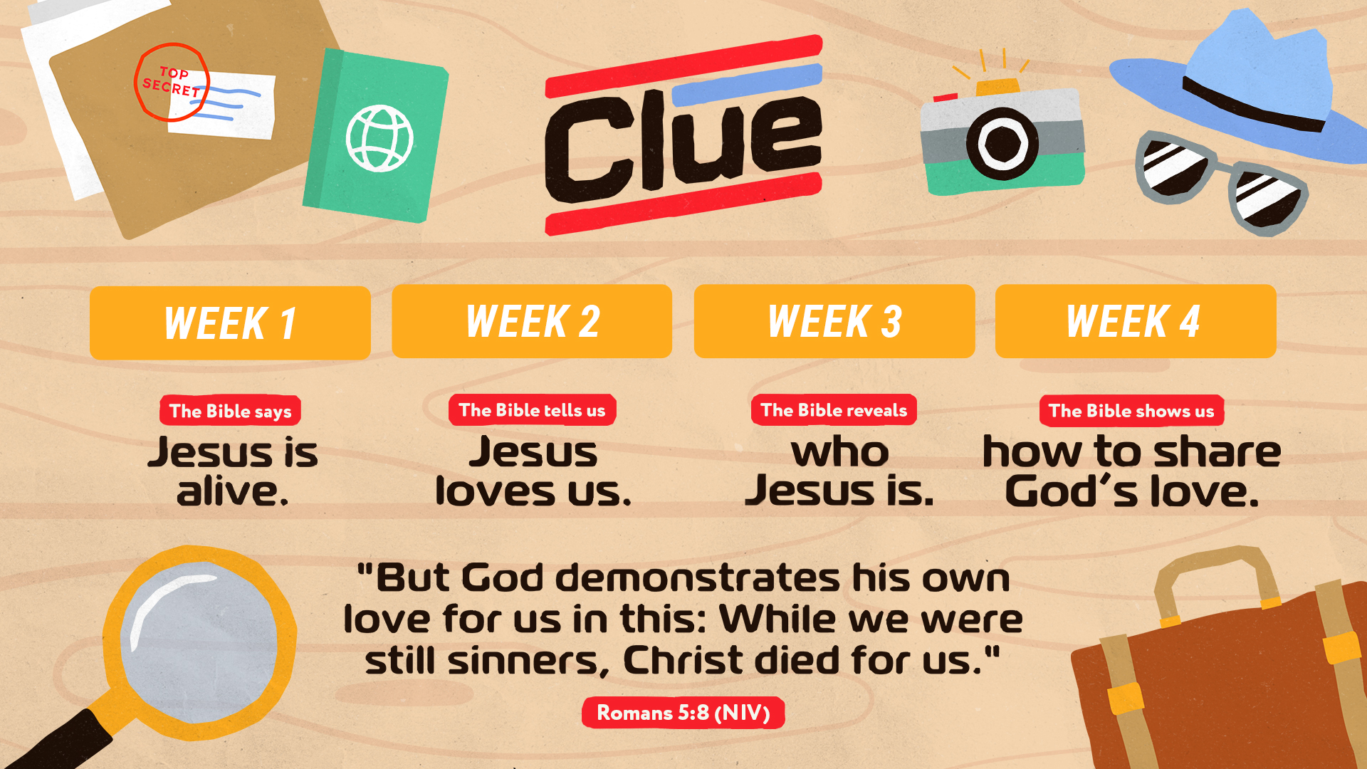 This series kicks off with the greatest news ever—Jesus is alive! But even his closest friends were surprised by what they discovered. Each week, kids will follow the clues in the Bible, looking at the stories leading up to Easter and connecting them to other moments in Jesus’ life and ministry. Along the way, they’ll see that the Bible isn’t just full of clues about who Jesus is—it’s the complete story of God’s love. In this 4-week series, kids will learn that the Bible says Jesus is alive, the Bible tells us Jesus loves us, the Bible reveals who Jesus is, and the Bible shows us how to share God’s love.