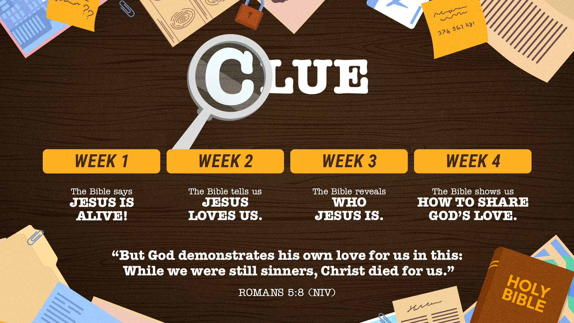 This series kicks off with the greatest news ever—Jesus is alive! But even his closest friends were surprised by what they discovered. Each week, kids will follow the clues in the Bible, looking at the stories leading up to Easter and connecting them to other moments in Jesus’ life and ministry. Along the way, they’ll see that the Bible isn’t just full of clues about who Jesus is—it’s the complete story of God’s love. In this 4-week series, kids will learn that the Bible says Jesus is alive, the Bible tells us Jesus loves us, the Bible reveals who Jesus is, and the Bible shows us how to share God’s love.